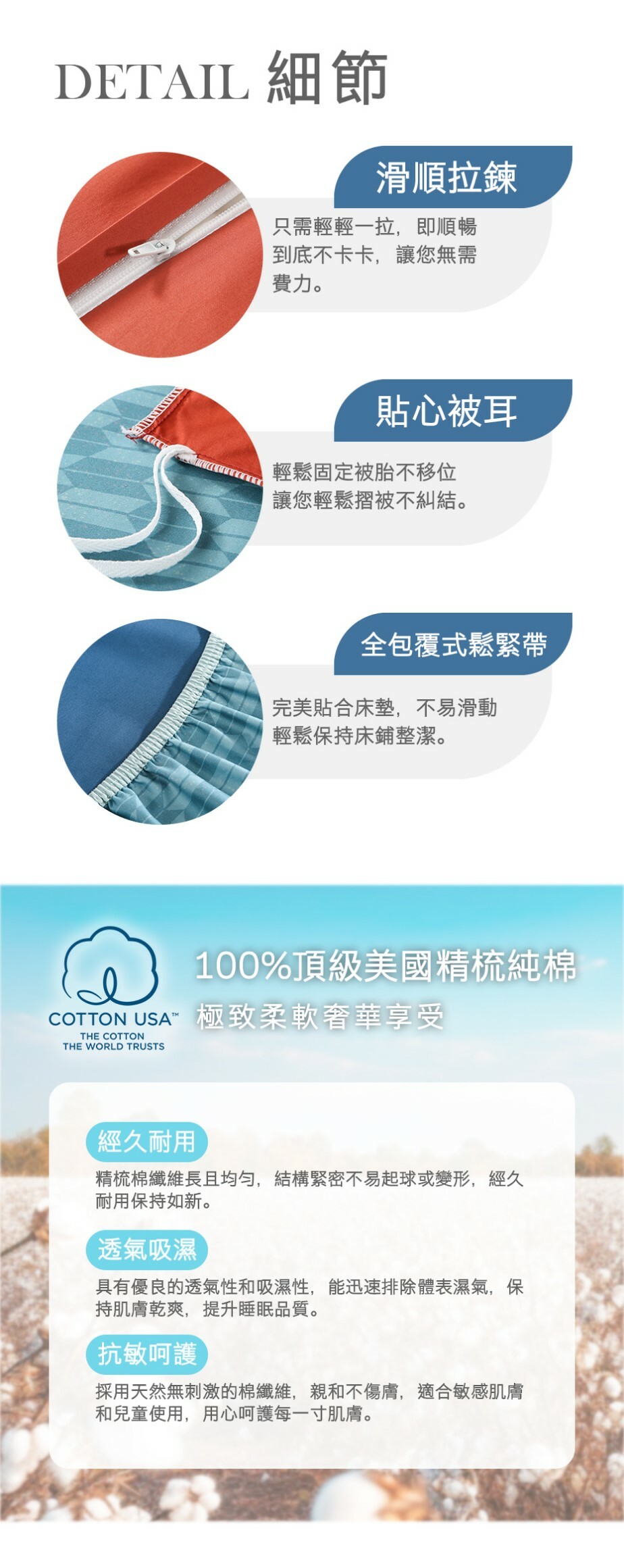 表/裡布: 100% 高級美國精梳純棉(60支棉)