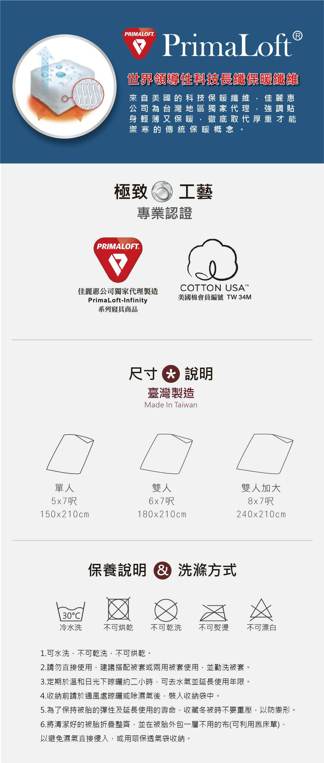 100% Polyester 聚酯纖維 (Primaloft美國保暖專利長纖棉)