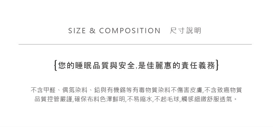 選用60支高支數高密度精梳純棉,手感細膩細緻,天然纖維環保透氣舒適,給予肌膚最親膚的體驗。